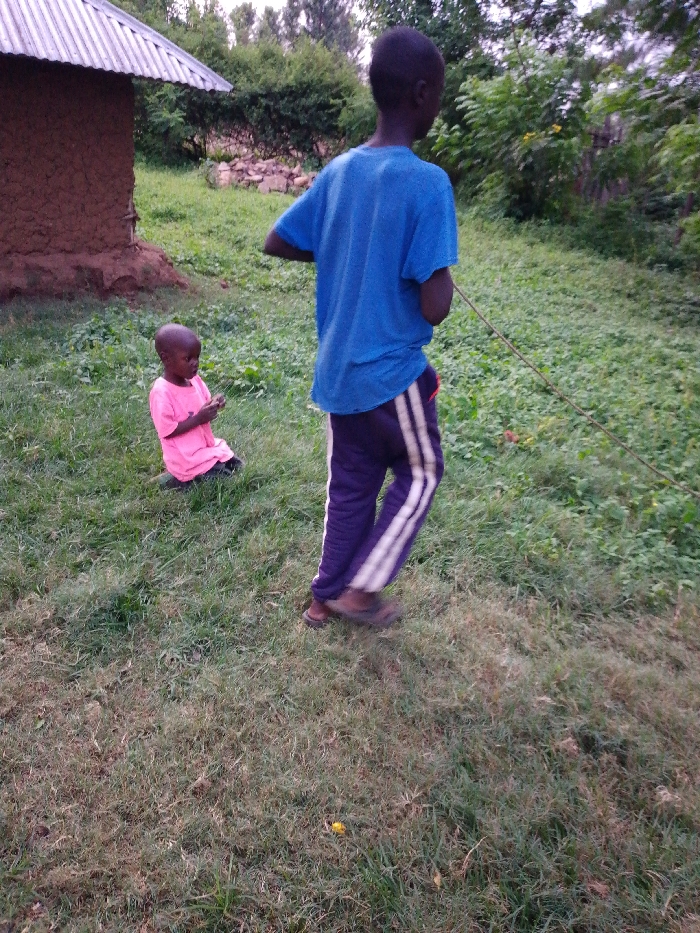Two children are in a grassy field near a small, mud-walled structure with a corrugated metal roof. One child, wearing a pink shirt, is seated on the grass. The other child, dressed in a blue shirt and dark track pants with white stripes, is standing and facing away from the camera, holding what appears to be a rope. The background includes green foliage and trees.