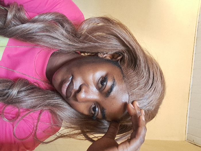 A close-up, eye-level indoor shot shows a young adult female from the chest up, positioned slightly off-center to the left. She has a dark complexion, dark eyes, defined eyebrows, and full lips. Her head is tilted slightly down, and her gaze is directed downward and to her right. She wears a long, wavy, light brown/ash-blonde wig with a visible lace frontal at the hairline. Her right hand is raised, with the tips of her fingers touching her forehead near the wig's edge. She is dressed in a bright pink crew-neck long-sleeved shirt. A thin, silver-colored chain necklace rests over her shirt. She wears a small silver-colored stud earring in her left earlobe and a large, gold-toned, abstract-shaped earring in her right ear. The background consists of a plain, light yellow wall with a white ceiling panel or trim visible at the top edge of the frame. The location is an interior space in the city of Unknown, Unknown.