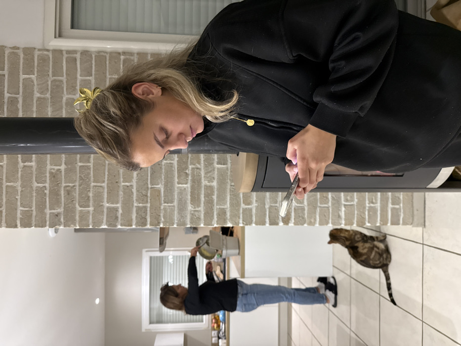 A woman in a black hoodie stands in front of a brick wall and a dark gray fireplace, looking at a phone in her hands. Her blonde hair is adorned with a gold crown. In the background, a kitchen scene unfolds. A second woman in blue jeans and a black top holds a pot above her head near a window. A cat with a patterned coat and tail sits nearby on a tiled floor, facing right.