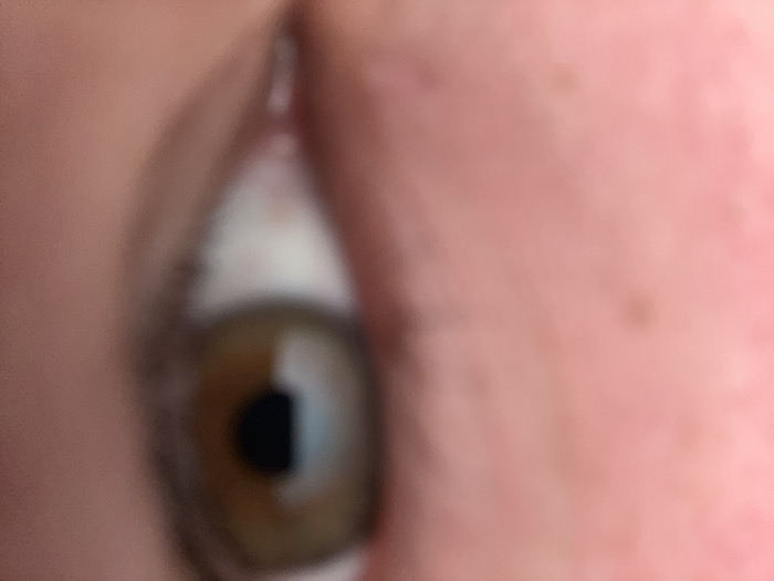 A blurry, extreme close-up captures a hazel eye and surrounding skin