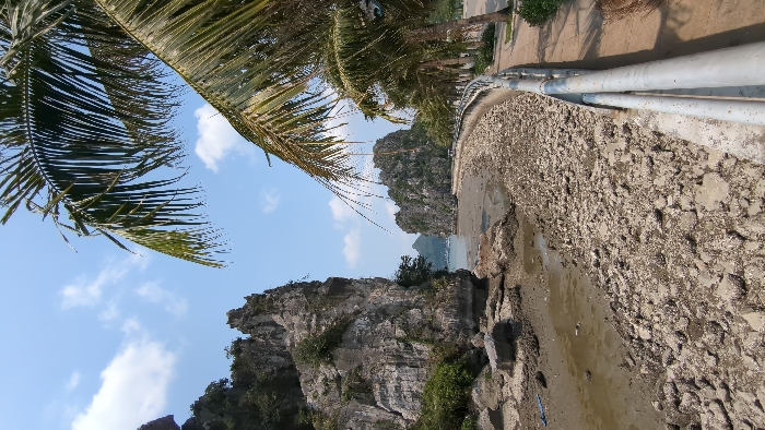 The image depicts a coastal scene in Hong Gai Ward, Vietnam, under a clear blue sky with scattered white cumulus clouds. In the foreground, large green palm fronds extend from the upper right, partially obscuring the sky. To the right, a paved pedestrian walkway with a grey metal railing, consisting of two horizontal pipes, runs parallel to the coastline, lined by a row of palm trees. To the left of the walkway, a wide intertidal zone is exposed, characterized by a muddy, light brown seabed heavily covered with numerous small, light-colored bivalve shells or rocks, indicating low tide. A small, irregular pool of standing water is visible within the mud towards the left foreground. Further left, a large, prominent limestone karst formation rises steeply from the water's edge, exhibiting visible stratification and sparse green vegetation clinging to its crevices. In the midground, the intertidal zone extends towards a body of water, beyond which additional smaller limestone karsts are visible. Several boats are anchored or docked in the calm water between the land and the distant karsts. No human figures or discernible activities are present in the frame.