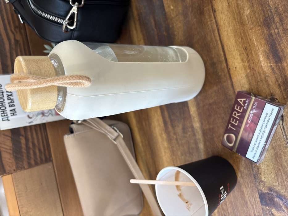 The image displays a static, slightly elevated perspective of a collection of personal items resting on a light brown wooden plank table, likely within an indoor cafe setting in Sofia, Bulgaria. In the lower left, a black disposable paper coffee cup, with a white interior, contains a small amount of light brown liquid residue and a wooden stirring stick. Partial white branding on the cup includes the letters "NI COFF". Adjacent to it, centrally positioned in the lower half of the frame, is a sealed, dark reddish-brown rectangular packet of "TEREA RUSSET for IQOS ILUMA" tobacco sticks, wrapped in clear plastic. A Bulgarian health warning is prominently visible on its surface. To the right and slightly behind these items, a clear glass reusable water bottle stands upright. It is approximately two-thirds full of clear liquid and encased in a cream-colored silicone sleeve that exposes part of the glass. The bottle is capped with a light wooden screw-on top, from which a light peach braided fabric loop extends. In the upper left background, a light beige or taupe shoulder bag with a visible strap and silver-colored buckle is partially present. In the upper right background, a black handbag with metallic silver chain details and a zipper pull is partially visible. Directly behind the water bottle, a white book with a visible spine or cover displaying Cyrillic text, including "ДЕНОНОЩНО" and "НА ВЪРХ", is propped up. No individuals are visible in the frame. The scene presents an arrangement of objects suggesting recent personal use or a temporary gathering point.