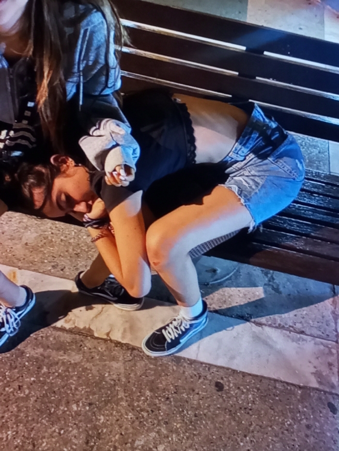The image depicts two individuals on a dark brown slatted wooden bench in Aktash, Uzbekistan, under low-light conditions, likely at night. The ground consists of concrete paving with a lighter-colored concrete or stone edge. Subject 1, a young female, is slumped forward on the bench, resting her head against the mid-torso of Subject 2. She is wearing a black tank top or camisole with a visible black lace trim at the back, light blue denim cut-off shorts with frayed edges, white ankle socks, and black low-top sneakers with white laces and soles. Her right arm is bent, and multiple wristbands are visible. A small abrasion or mark is present on her right knee. Her dark hair is short or tied back. Subject 2, a young female, is seated upright on the bench, supporting Subject 1. She is wearing a grey hooded zippered sweatshirt, with long dark brown hair flowing over Subject 1's head. Her left hand is visible near Subject 1's back/shoulder, showing light-colored nail polish. Her right arm is also visible, bent at the elbow. Strong artificial lighting casts distinct shadows on the ground, indicating a localized light source from above or to the side.