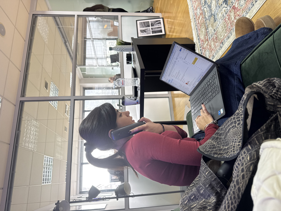 The image captures an indoor office scene located in Paleo Faliro, Greece. A female individual, with dark hair tied in a high ponytail, is seated on a dark green upholstered surface. She wears a long-sleeved maroon top, dark blue jeans, and tan-colored platform boots. She is actively engaged in two tasks: holding a dark cordless phone to her right ear with her right hand and typing on a grey laptop with her left hand, which displays an email client. A dark fabric with a textured, scale-like pattern is draped on the upholstered surface to her left. Behind her, a dark rectangular desk holds a "ΒΙΚΟΣ" brand water bottle, a patterned paper coffee cup, a black object, and a striped water bottle. To the far right, a framed black-and-white multi-panel photograph leans against the wall. The floor is light-toned hardwood, partially covered by a patterned rug with blue, red, and beige hues. The office is brightly lit, with light-colored ceiling panels incorporating square fluorescent light fixtures. Clear glass partitions with white frames separate the immediate area from other office spaces in the background. Through these partitions, a male figure is observed seated at a desk in an adjacent room, and another individual is partially visible standing further in the background to the right.