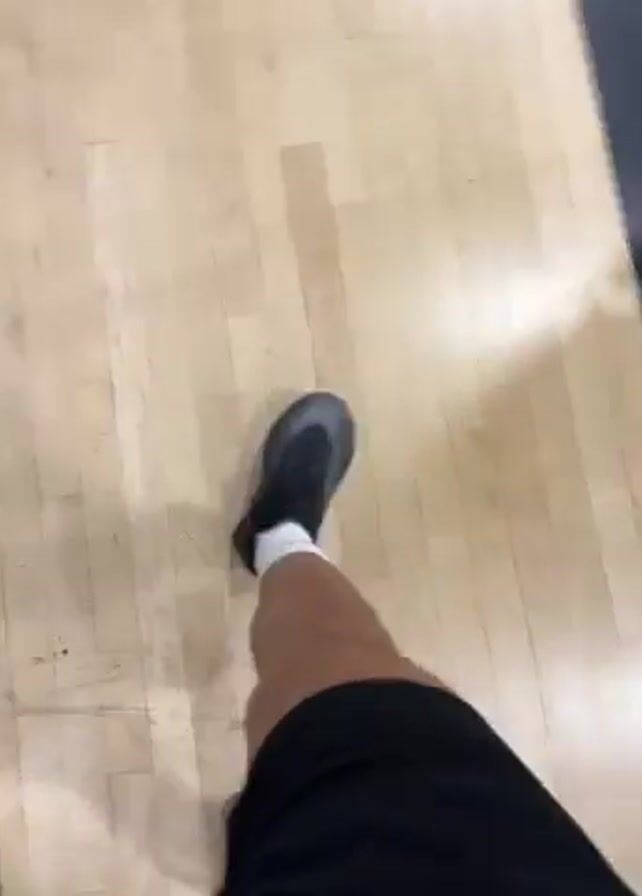 The video starts with a first-person view of a person wearing black shorts, white socks, and black shoes walking on a wooden basketball court