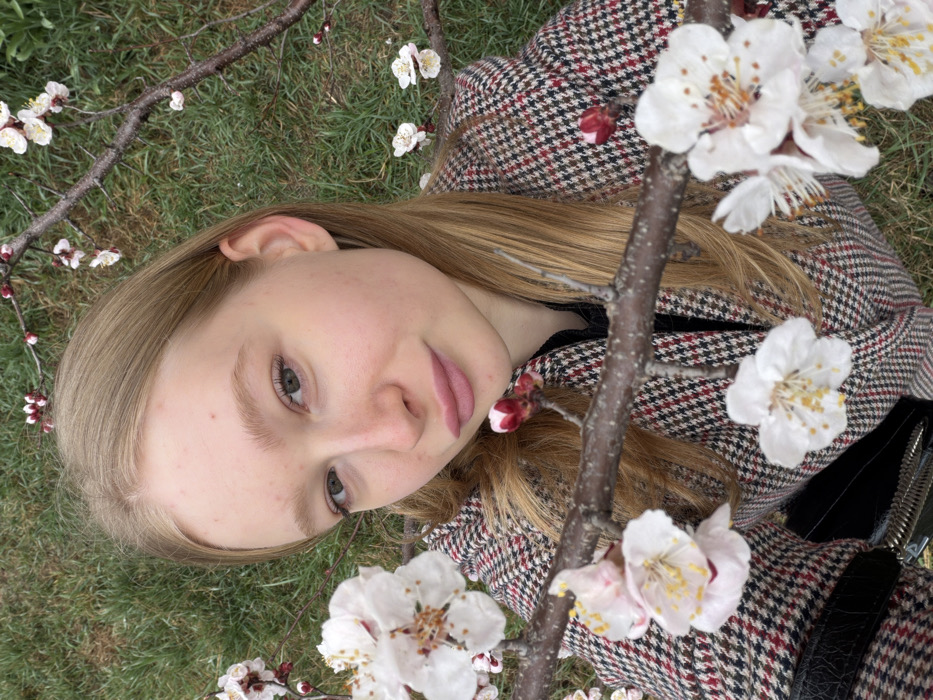 A young woman with fair skin and long, straight blonde hair lies on a grassy surface, surrounded by flowering tree branches