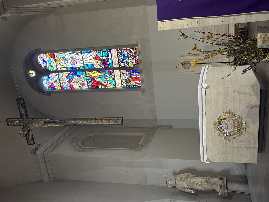 The image depicts the interior of the Duomo di San Feliciano (Cathedral of San Feliciano) in Foligno, Italy. The view is directed towards the main altar and a section of the chancel. A large, ornate crucifix, featuring the figure of Jesus Christ, is suspended from the ceiling in the upper-left quadrant. The cross itself is dark with gilded or decorative elements along the vertical beam. To the upper right, a tall, arched stained-glass window displays multiple vibrant religious scenes in panels dominated by blue, red, yellow, and green hues. In the lower-center, a rectangular altar, constructed of light-colored stone (possibly travertine), is covered by a white linen cloth with thin blue and purple stripes. The front of the altar is adorned with a prominent gold-colored circular relief sculpture, depicting a lamb and other symbolic elements. To the far left, a light-colored stone statue, identifiable as Saint Peter, stands on a decorative pedestal, holding keys in his left hand. A small white security camera is mounted on the upper-left wall below the crucifix. To the right of the altar, a smaller stone lectern or ambo with a microphone stand is visible. Adjacent to it, on the floor, is a tall arrangement of bare branches with small yellow blossoms and green foliage. A vertical purple banner or cloth is partially visible on the far right. The surrounding walls are light-colored plaster, showing some subtle textural variations and featuring architectural moldings and a decorative recessed niche on the upper-left wall. The floor is a dark, smooth surface.