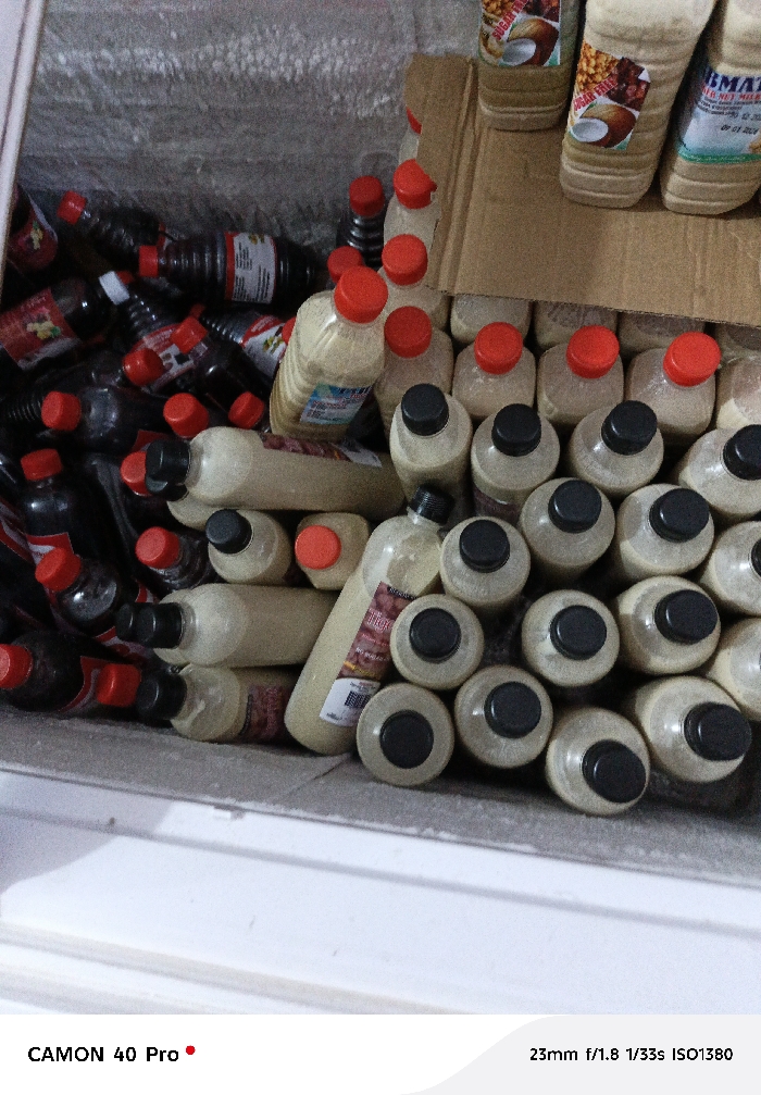 A close-up shot reveals a cluttered freezer filled with rows of plastic bottles. The bottles have a variety of tops, mostly black and red. Many bottles hold a beige-colored liquid, while others contain a dark liquid. Product labels are visible on some bottles. The background shows a freezer wall with condensation. A cardboard divider separates some of the bottles.