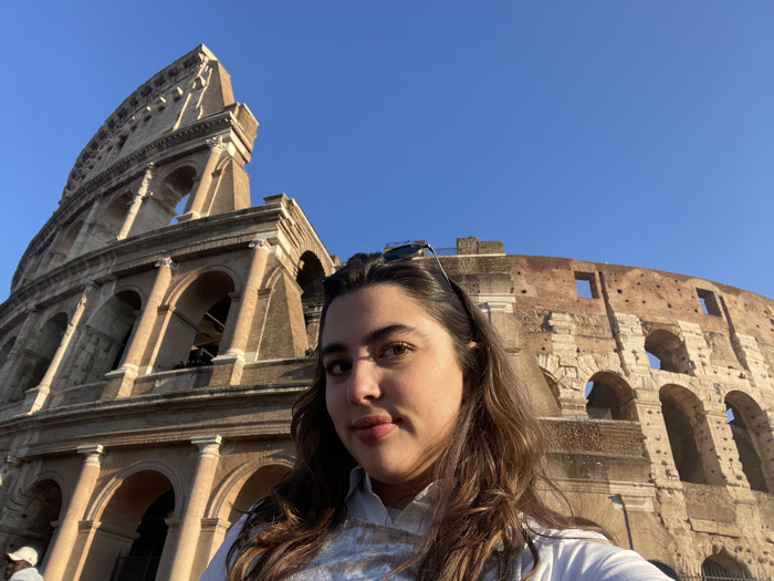 The image displays a self-portrait taken in front of the Colosseum in Rome, Italy