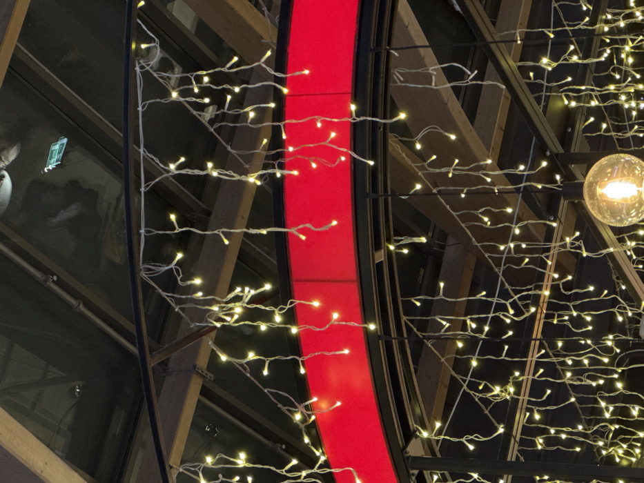 The scene depicts an indoor environment in Saint Petersburg, Russia, characterized by decorative lighting and architectural features. Numerous warm-white LED string lights, arranged in vertically hanging strands, illuminate the space. These lights are suspended from a dark, curved structural beam. Positioned below this beam is a prominent, horizontally oriented red illuminated band or sign. In the lower right, a single clear, spherical pendant light fixture with an exposed filament bulb is visible. The upper background consists of a dark, reflective ceiling surface, which subtly displays a silhouetted reflection of a human profile facing right, and a small, indistinct green rectangular object. Additional structural elements, appearing as beams, are visible through the framework. No active human subjects, specific actions, or interactions are directly present in the visible scene.