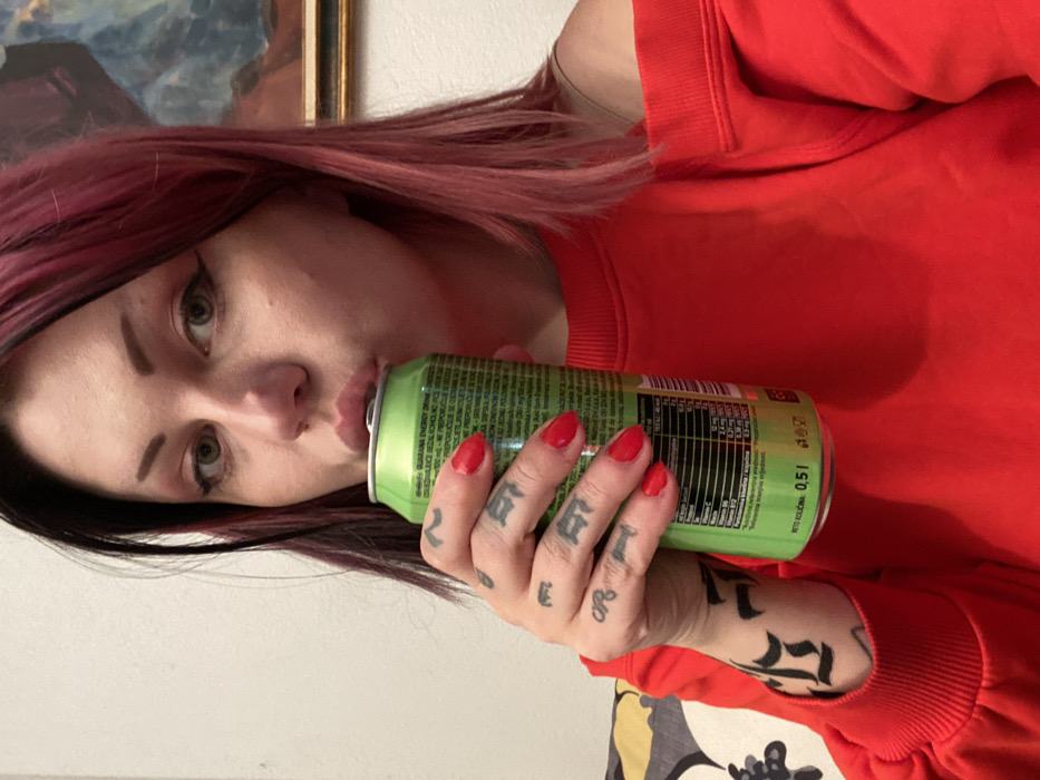The image displays a woman in an indoor setting within the city of Kunje, Montenegro. She is captured from the chest up, with dark roots transitioning to reddish-pink hair. Her left hand, featuring multiple small black finger tattoos and a larger black forearm tattoo, holds a green 0.5-liter energy drink can labeled "GUARANA ENERGY DRINK" to her lips. Her fingernails are painted red. She is wearing a red, long-sleeved, off-the-shoulder top. The background consists of a plain white wall, with a framed artwork depicting abstract blue and brown forms visible in the upper right quadrant. A segment of a patterned object is partially visible in the lower left of the frame.