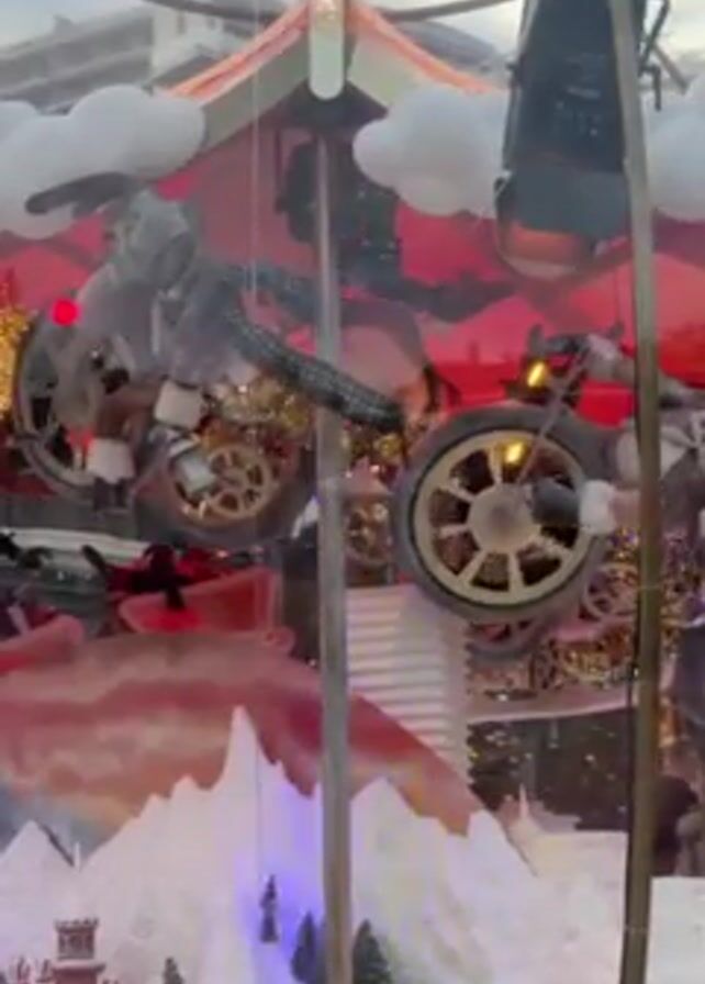A window display features a mechanical contraption that looks like a bicycle, rotating around a central pole