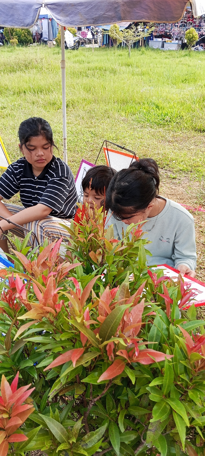 This image, captured in Bandasari, Indonesia, depicts three individuals engaged in an outdoor activity under a grey fabric canopy. The foreground is dominated by a bushy plant featuring green and reddish-orange leaves. To the left, a female with dark hair, wearing a black and white striped polo shirt and striped trousers, is seated on the ground, looking downward. Centrally, a child with dark hair and a red garment is partially visible behind the plant, also directing their gaze downward. To the right, a female with dark hair styled in a ponytail, wearing a light blue long-sleeved shirt with a cat emblem, is bent forward, focused intently on a white board with a red border, held in her left hand, suggesting an activity involving drawing or coloring. Behind the individuals, two black wireframe stands support white boards with yellow and orange trim. The background reveals a grassy field leading to a bustling outdoor market area, characterized by various stalls displaying hanging merchandise, distant indistinct figures, and a visible motorcycle. The scene is illuminated by natural daylight.