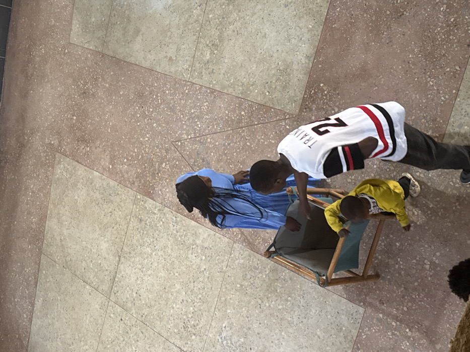 This image depicts an indoor scene in Rafin Par, Nigeria, observed from a high-angle perspective. Three individuals are present on a patterned tiled floor, which features alternating sections of light speckled and reddish-brown speckled terrazzo-style tiles. A woman, positioned on the left, wears a long, light blue dress and a dark head covering over dark, braided hair. She faces away from the camera, looking towards the center of the frame. To her right stands a male youth or young adult, wearing a white t-shirt with black and red striped sleeves, dark trousers, and dark shoes. The back of his shirt displays the word "TRAIN" vertically, followed by the number "24." He extends his right arm towards a wooden frame positioned between him and the woman. This frame is rectangular, made of light-colored wood, and contains a teal or dark green fabric insert, appearing to function as a hamper or storage bin. A young child, dressed in a bright yellow long-sleeved top and light-colored shoes, is partially obscured by the frame, bending or leaning into its lower section. The male youth appears to be interacting with either the child or the frame. A portion of a dark head or hair is visible at the bottom left edge of the image, suggesting an additional, mostly unseen individual. The overall environment is well-lit, with distinct shadows indicating an overhead light source.