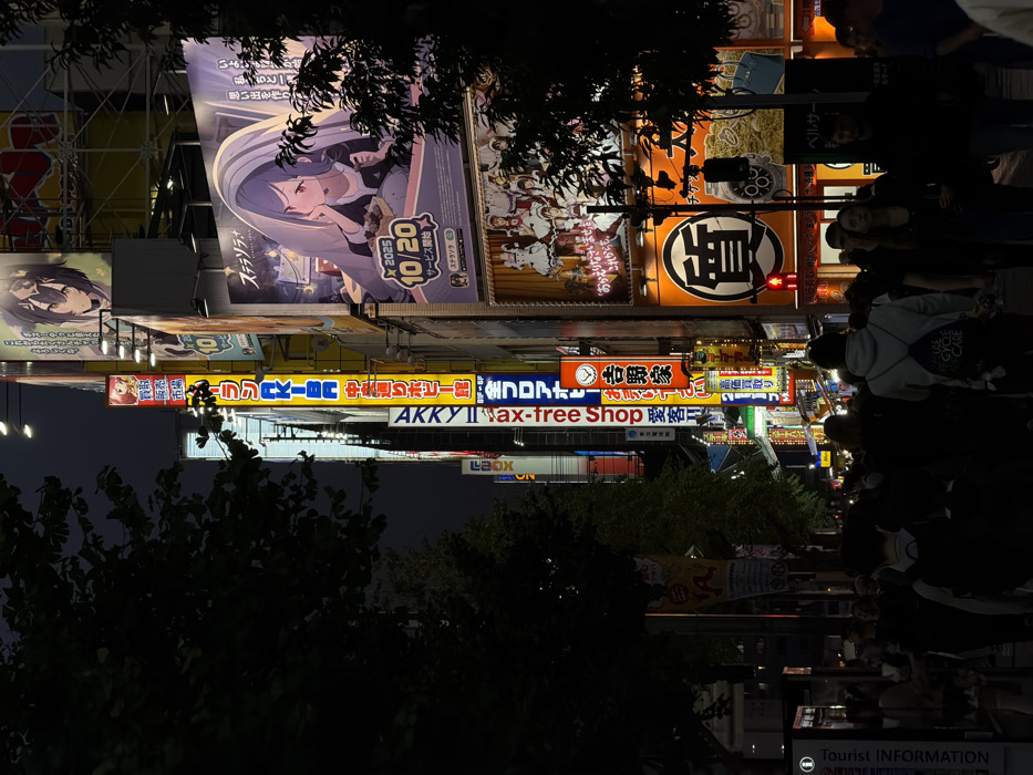 The image depicts a nocturnal street scene in the Akihabara district of Chiyoda, Japan