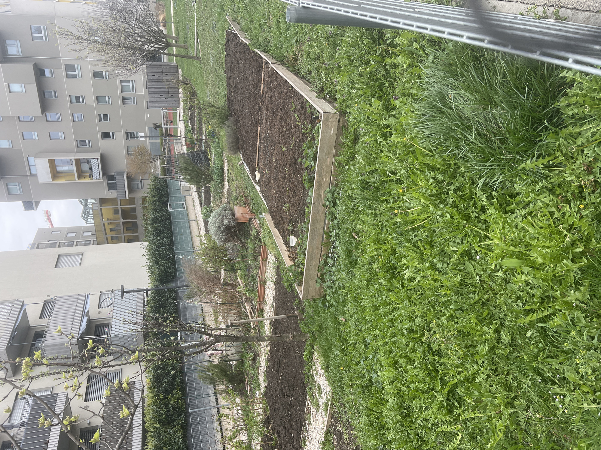 This image depicts an urban community garden located in Vienna, Austria, positioned among modern residential buildings under an overcast sky. The foreground presents a dense expanse of unkempt green grass, punctuated by numerous dandelions and other weeds. A metal fence post is partially visible on the far right. In the midground, multiple rectangular garden plots are visible. Several contain dark, tilled soil, while one prominent raised bed, framed with untreated wood, shows emergent strawberry plants and other small green vegetation. Gravel paths delineate these plots. A slender, leafless tree with nascent light-green buds stands centrally. A wooden-handled shovel leans against a stake within one of the garden beds. Further back, a low, green hedge runs horizontally, bordered by a metal grid fence. The background is dominated by contemporary, multi-story residential buildings featuring facades in shades of grey and beige, accented with some yellow elements and numerous windows. Balconies with privacy screens are present on these structures. A single individual, appearing male and dressed in a light-colored shirt and dark trousers, is observed standing near a wooden structure (possibly a shed or compost bin) within the garden area, facing partially away from the viewer. In the distant background, a construction crane is faintly discernible against the light grey sky.