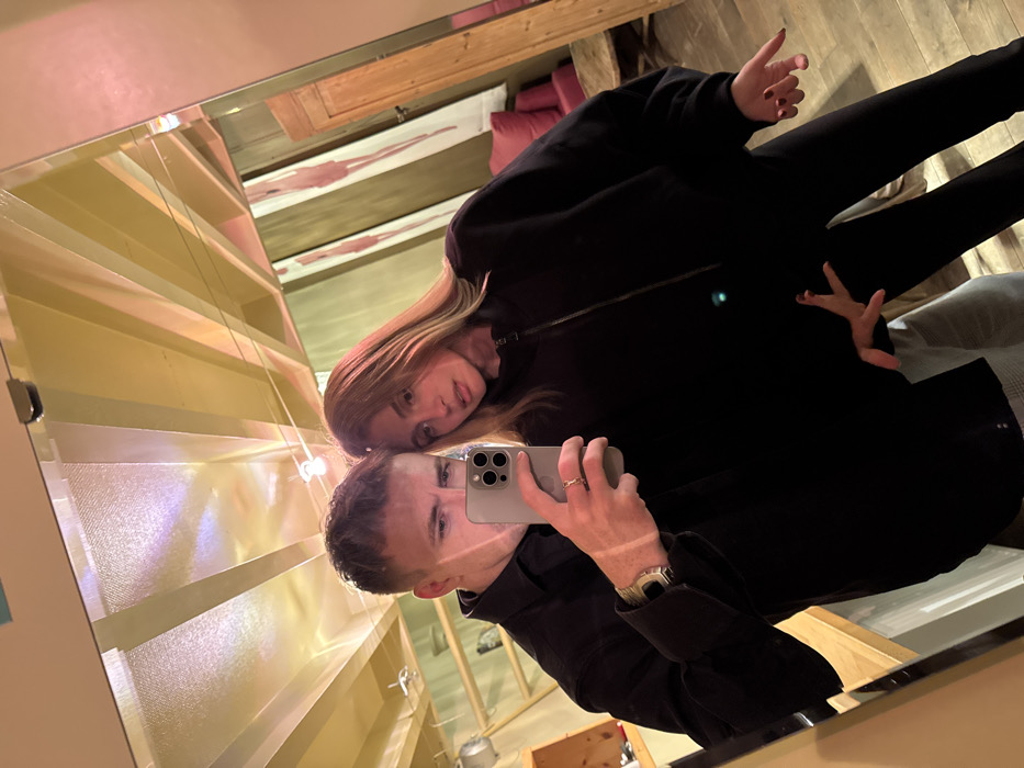 The image is a mirror selfie featuring two individuals, one male and one female, appearing as young adults, within an indoor setting