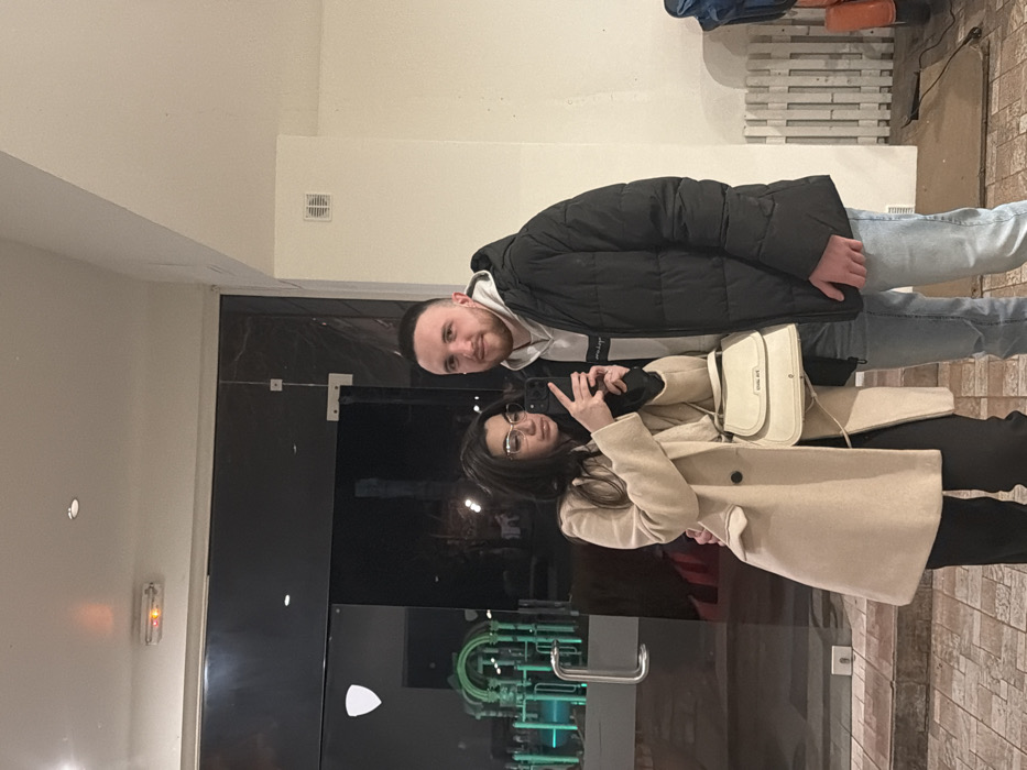 The image captures two individuals, a female and a male, standing in an illuminated indoor or semi-enclosed area next to a large glass entrance at night, in the city of Karlovo, Bulgaria