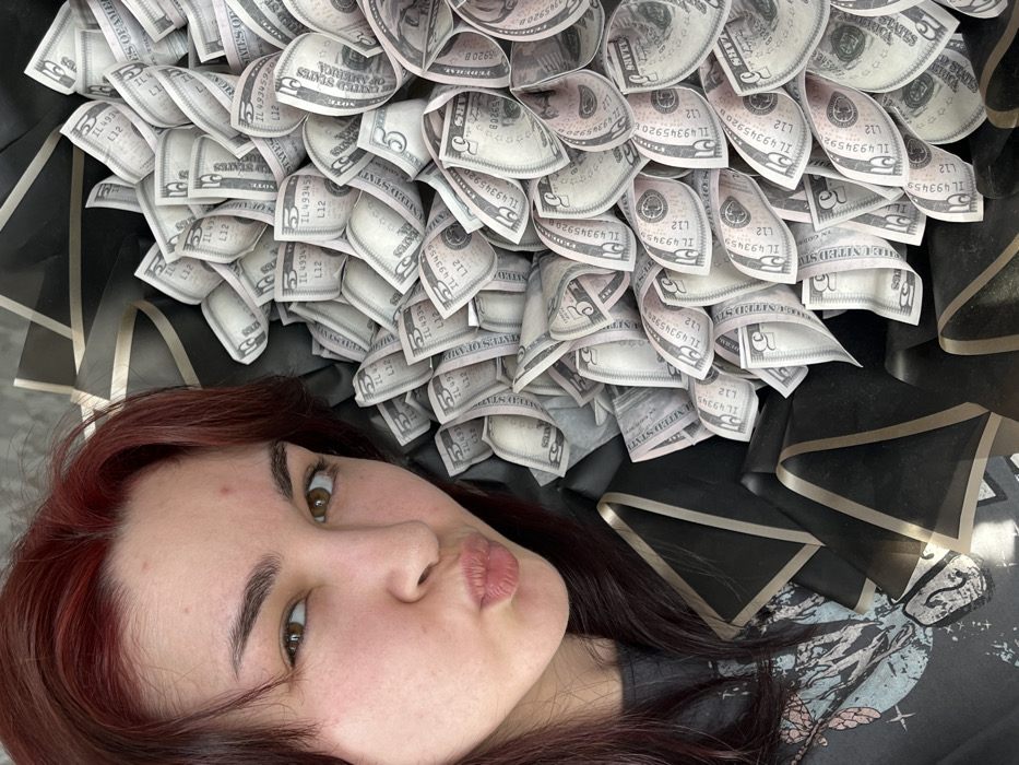 A young adult female with reddish-brown hair and an olive complexion is captured in a close-up, upward-angled image. She looks directly towards the camera with brown eyes, her lips pursed in a "kiss" expression. Minor skin blemishes are visible on her forehead. She is wearing a grey t-shirt with a light-colored graphic design partially visible on her left side. To her right and below, a dense, decorative arrangement of numerous folded United States five-dollar bills occupies a significant portion of the frame. The bills are curled and presented akin to a floral bouquet. This money arrangement is encased in dark, possibly black, wrapping material featuring light grey or silver geometric patterns, specifically triangles and lines. Visible serial numbers on the five-dollar bills include "IL 49345920 B" and "L12." The precise location within Starobaltachevo, Russia, is not identifiable from the visual information presented in the image.