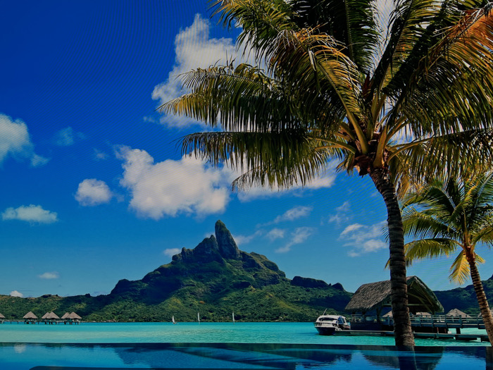 The scene depicted does not represent a location within Lillestrøm, Norway. Instead, it features a tropical island landscape under a clear blue sky with scattered white cumulus clouds. In the foreground, an infinity pool with deep blue water reflects the sky. To the right, two palm trees, one large and central, the other smaller, frame the scene. The midground consists of a calm, turquoise lagoon. On the left, a series of overwater bungalows with thatched roofs are visible on stilts. To the right, a wooden pier extends into the water, connecting to a larger thatched-roof structure. A white leisure boat is docked alongside this structure. Several small white sailboats are scattered across the water in the mid-distance. The background is dominated by a large, lush green volcanic mountain with a distinct jagged peak, characteristic of Mount Otemanu, rising from the island. No individuals, explicit actions, or interactions are observable.