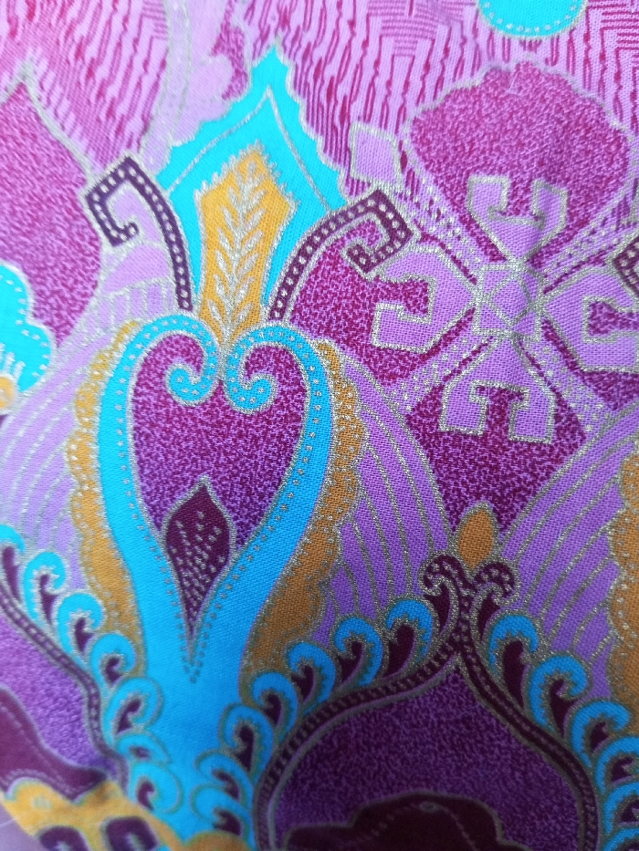 A vibrant textile displays intricate patterns in shades of purple, pink, and turquoise, accented with touches of gold