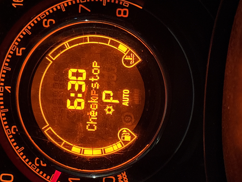 The image displays a close-up, head-on view of a vehicle's instrument cluster, predominantly illuminated in orange-amber against a dark background. The protective screen over the digital display is visibly scratched. Centrally, the digital time "6:30" is displayed. Below this, a text message reads "Cheekfstop," which appears to be a partially corrupted or formatted warning, possibly related to a "Check-stop" or similar vehicle system alert. Beneath this message, a snowflake or gear-like icon is positioned to the left of a capital "P" symbol, with the word "AUTO" displayed directly underneath "P." On the lower-left section of the digital display, a fuel pump icon is visible, adjacent to a faint "S" symbol. On the lower-right, a thermometer icon is present. Surrounding the central digital area is an analog-style gauge with a numerical scale from "0" to "8" and small indicator marks. The illumination of the display suggests the image was captured in a low-light environment, such as inside a vehicle cabin at night. The image itself provides no visual elements or contextual information to confirm a specific geographic location within Montreal, Canada.