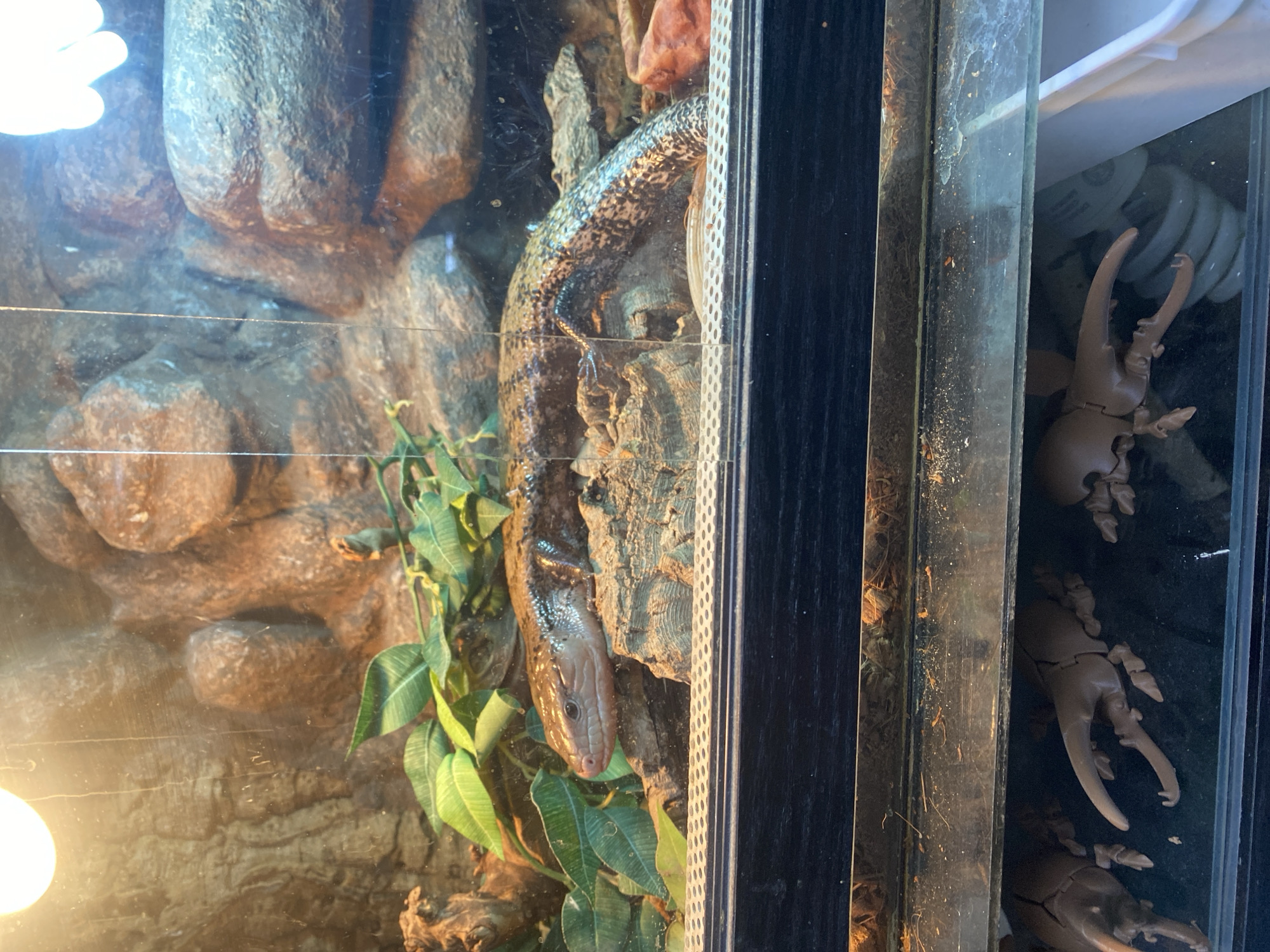 n indoor terrarium. Inside, a blue-tongued skink is resting on a piece of cork bark, surrounded by artificial foliage. The terrarium has a glass front, and the interior appears to be decorated with artificial rock formations. Outside the terrarium, to the right, are artificial stag beetles mounted in a display case, and a fluorescent bulb can be seen. The scene is indoors, likely in a home or pet store. There is no information to suggest this image was taken in the city of Sofia, Bulgaria.