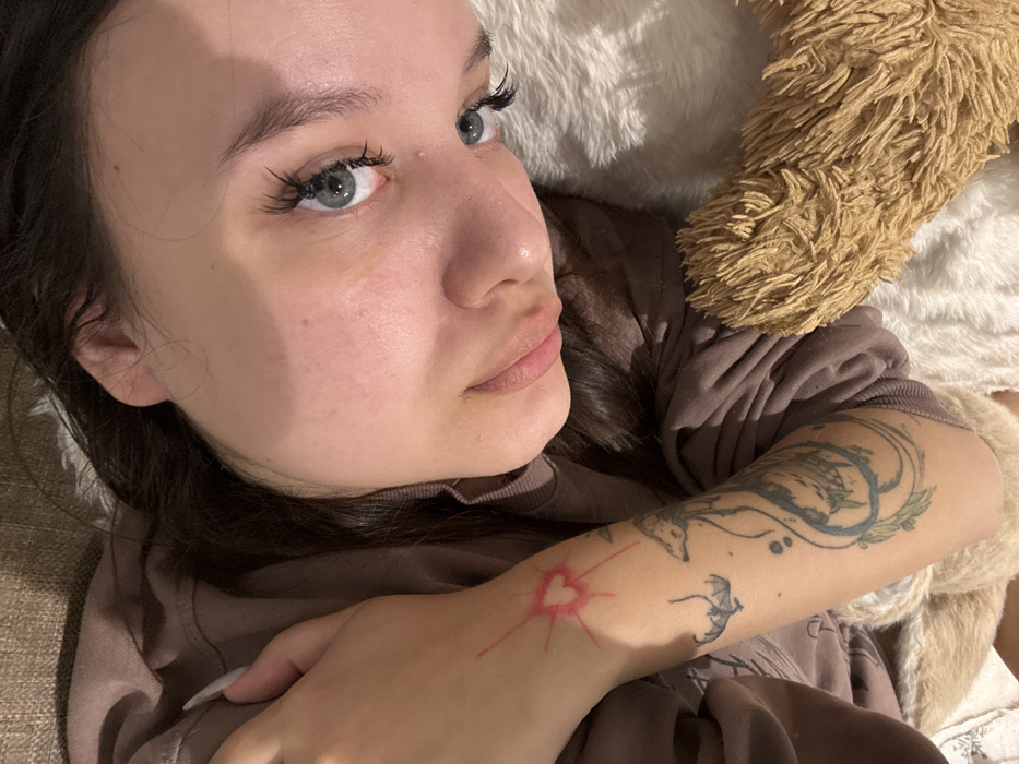 An overhead close-up image taken in Kiryat Motzkin, Israel, depicts a female subject lying on her back, looking upward. Her head is slightly turned to her right. The subject has fair skin, light blue-grey eyes with prominent, long black eyelashes, and full, pink-tinted lips. A small, raised white lesion is visible on her right cheekbone, inferior to her eye. She is wearing a brown or mauve long-sleeved garment. Her left arm is visible, adorned with several tattoos: an intricate design featuring a castle and foliage with a stylized animal on the upper arm, a small winged bat or dragon-like creature on the forearm, and a distinct red heart outline with radiating lines on the wrist area. A large, light-brown, shaggy plush object, likely a teddy bear, is partially visible on the left side of the frame. The subject is positioned on a soft, textured surface composed of white fluffy material and a darker, possibly beige fabric.