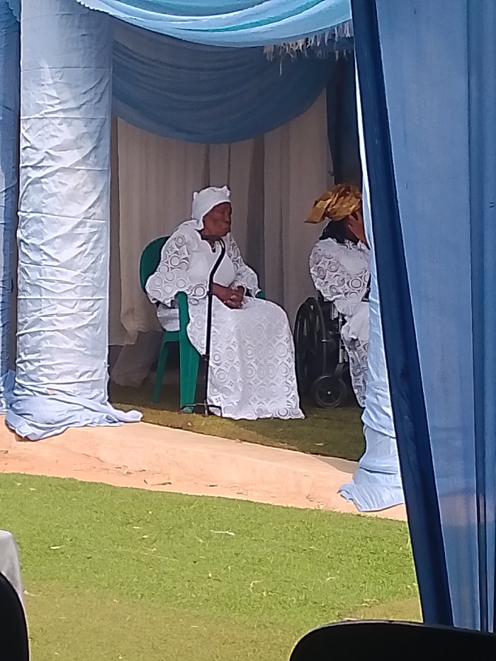 The scene depicts an outdoor or semi-outdoor event in Ufuma, Nigeria, characterized by ceremonial fabric decorations. Two individuals are seated under a canopy draped with light blue and darker blue fabrics. On the left, an elderly woman is seated upright in a dark green plastic chair. She wears a white headwrap and a long-sleeved white dress with a patterned lace overlay featuring concentric circles. Her hands are clasped in her lap. A black walking stick rests against her left side, extending to the ground. She gazes towards the right, out of frame. To her right, a second individual is partially visible, seated in a black wheelchair. This person also wears a white garment with a similar patterned lace and a gold-colored headwrap. The back wheel of the wheelchair is clearly visible. The ground consists of a patch of green grass where the chairs are placed, bordered by a lighter-colored, possibly sandy or dirt path in the foreground. Large structural columns, wrapped in light blue fabric, flank the seating area. A prominent dark blue fabric drape on the far right partially obscures the scene. The overhead canopy structure is further adorned with a light-colored, fringed fabric element.
