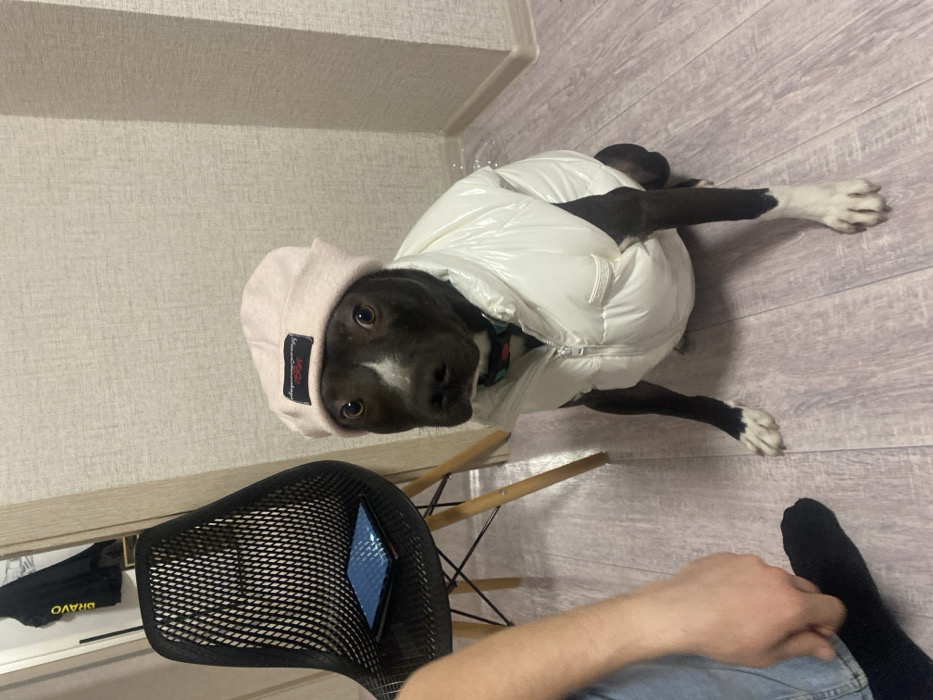 A dog wearing a white puffer jacket with a pink hoodie is lying on a wooden floor. The dog is dark with white paws. A black mesh chair with a phone or tablet on the seat is to the left. A person's arm and leg are visible in the bottom right corner, wearing jeans and a black sock. A wall is in the background.