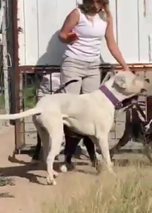 A woman stands outside a white building while holding her cell phone. Three dogs, two dark and one white, stand and move around the woman. The white dog has a purple collar. The woman pets the white dog as she walks toward the right of the screen. Tall grass is visible in the foreground. A metal fence is visible in the background.