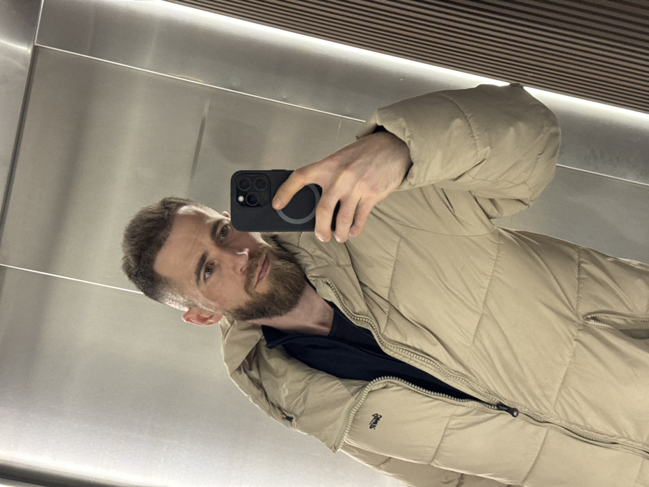 A man in a tan puffer jacket takes a selfie in a mirrored space. He holds a black iPhone with a MagSafe ring. The jacket's zipper is partially open, revealing a black shirt. His beard is short and well-groomed, and his hair is closely cropped. The reflection shows a ceiling with linear design elements. The overall aesthetic is casual.
