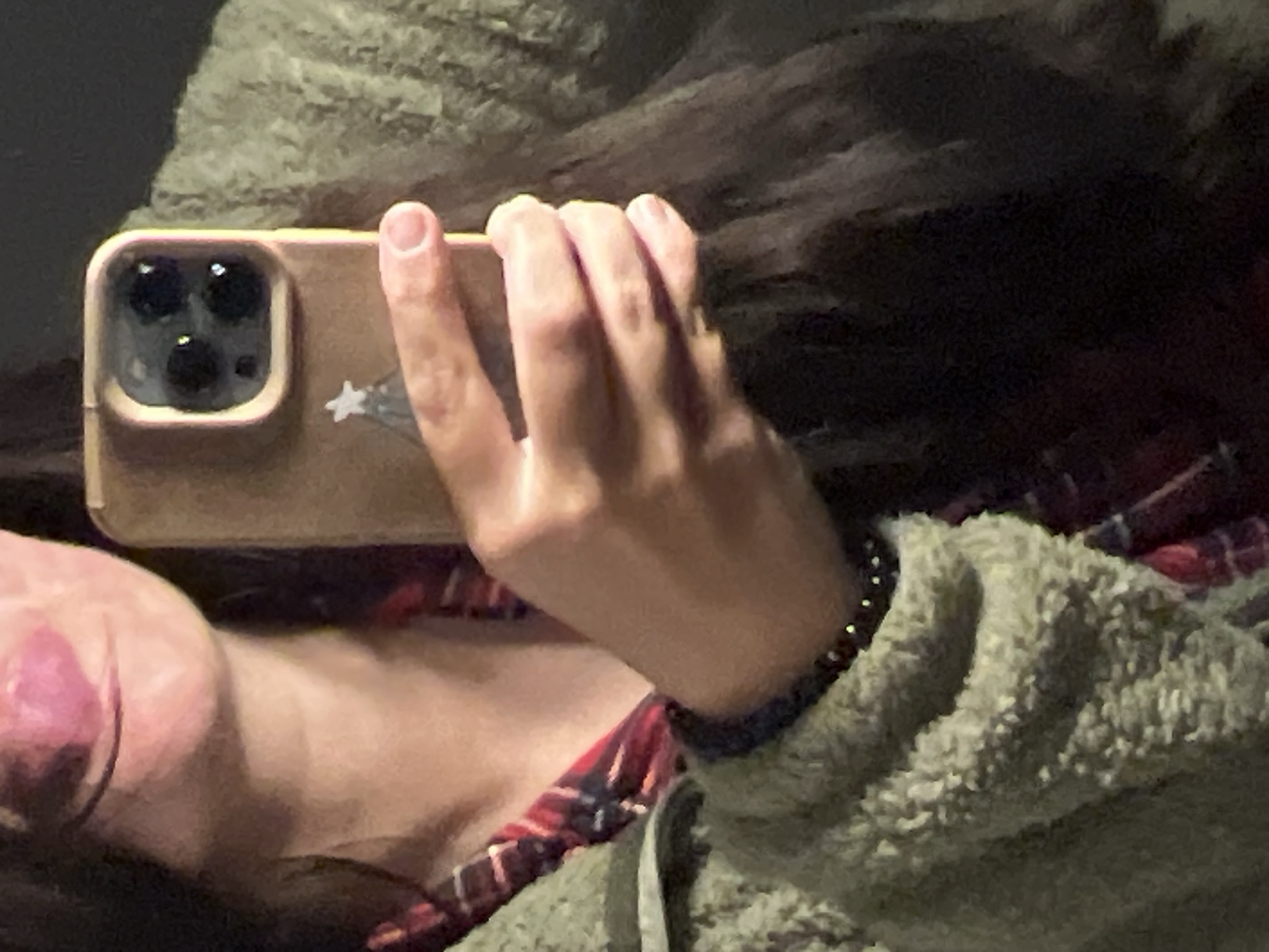 A person holds a cell phone in their left hand. The phone is in a light brown case with a star sticker. The person's hand is positioned in front of their face. The person is wearing a plaid shirt and a fuzzy green jacket. The background is dark and out of focus. The image does not provide sufficient information to determine the location as Kiryat Bialik, Israel, or any other specific location.