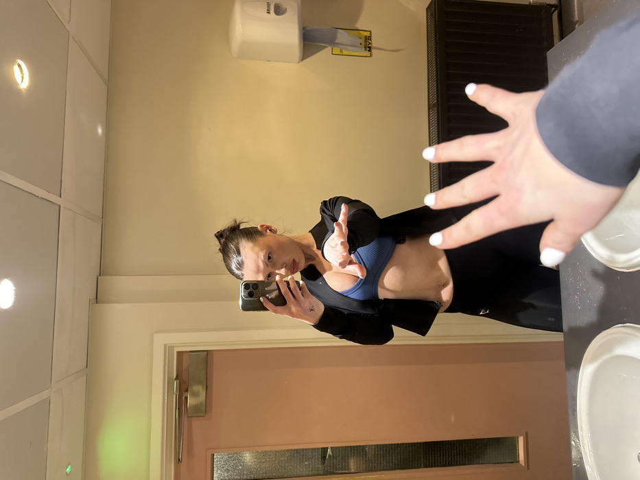 In a mirror selfie, a slender woman with her hair in a bun is holding a phone and wearing a blue sports bra under a black jacket. She's in what appears to be a public restroom with peach walls, a white ceiling, and a door. Her other hand is extended towards the mirror. The shot captures part of two sinks and another person's arm with white nail polish on their nails. The lighting is bright and somewhat unflattering.