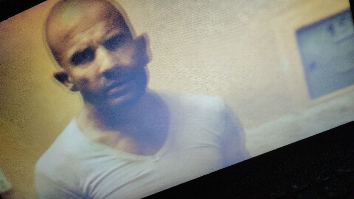 The image is a digitally captured photograph displaying an indoor scene, specified as being in Schiltigheim, France. The primary subject is an adult male, bald or with extremely short hair, occupying the left and central portion of the frame. He wears a light-colored, likely white, V-neck shirt. His head is slightly tilted, and his gaze is directed towards the viewer. Distinct ears protrude from his head. Facial features are partially obscured due to the image's low resolution, blur, and pixelation, characteristic of a screen capture. The background features a plain, light-colored wall, possibly beige or off-white. In the upper-right background, a rectangular object, resembling a window or a framed item with a darker interior, is affixed to the wall. The entire visual field is tilted diagonally relative to the frame.