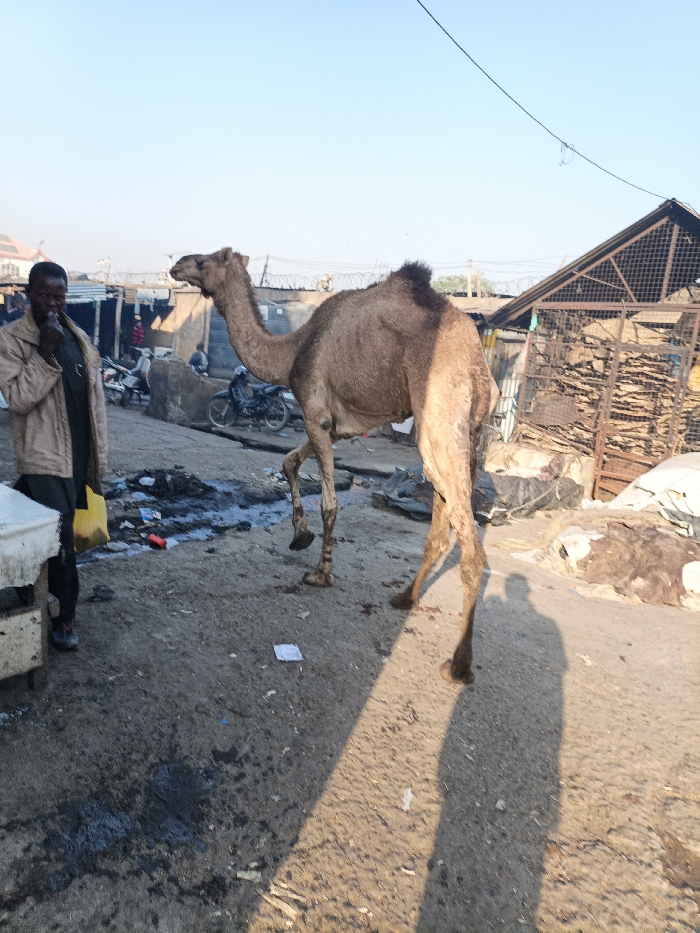 The image portrays an outdoor street or market scene in Fagge D2, Nigeria, under clear, bright daylight with prominent shadows. A dromedary camel, light brown with a dark hump, is captured in mid-stride, moving from left to right across the frame, its head turned left. To the left of the camel, an adult male stands, facing slightly towards the camel. He wears a light brown jacket over dark clothing and sneakers, holding a yellow plastic bag in his left hand, with his right hand near his mouth. The ground is unpaved, consisting of dirt and mud, with visible puddles or dark liquid stains and scattered refuse, including plastic containers and paper. A white, rectangular object, possibly a counter, is partially visible on the far left. Shadows, including that of the photographer and the camel, are cast prominently on the ground towards the right. In the background on the left, several makeshift structures with corrugated metal roofs and walls are visible, along with barbed wire. Multiple individuals and at least two motorcycles are present further down the street. On the right, a dark-roofed structure with a grid-like side stands, adjacent to and behind which are substantial piles of dried animal hides or skins. The sky is clear blue with a single overhead wire visible in the upper right quadrant.
