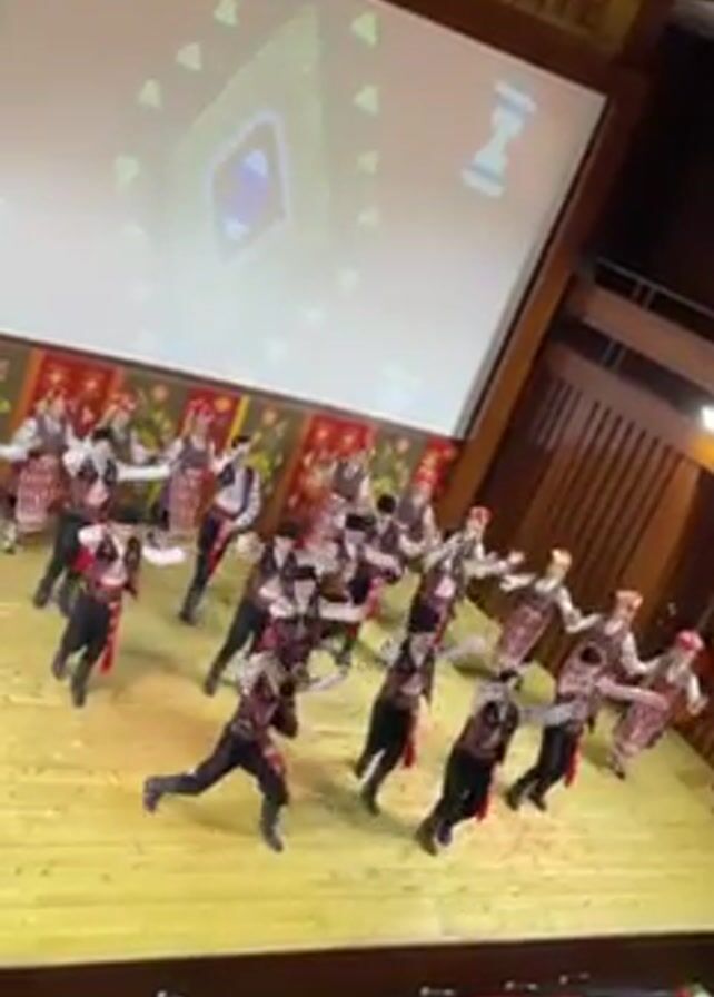 A high-angle shot captures a group of approximately 20 dancers on a wooden stage, performing what appears to be a traditional folk dance. The dancers are clad in colorful costumes with black pants and vests, adorned with red sashes. Some of the performers wear white head coverings with red or multi-colored accents. The dancers move in unison, stepping and extending their arms. Behind the dancers, a large projection screen displays geometric shapes. Above the screen, wooden paneling is inscribed with text in what appears to be Cyrillic script. The stage is bathed in light, accentuating the wooden surface. In the foreground, the lower portion of a red-carpeted audience section is visible, along with the corner of a wooden banister. The camera remains static.
