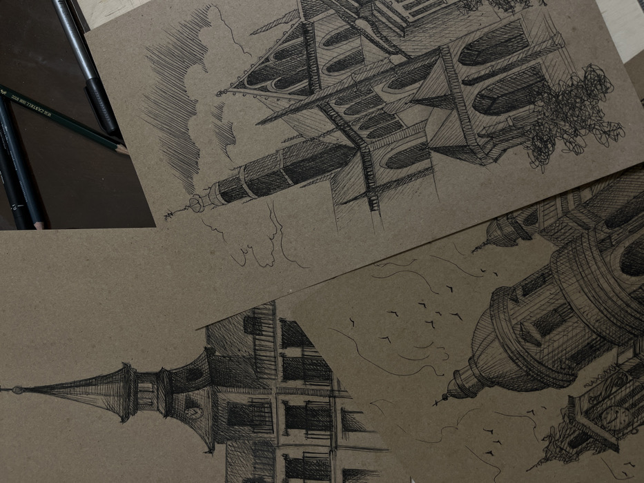 - "The scene displays three distinct architectural sketches rendered in black ink on brown kraft paper, partially overlapping and situated on a dark, flat surface" by FM-lYGAC3, licensed under CC BY 4.0