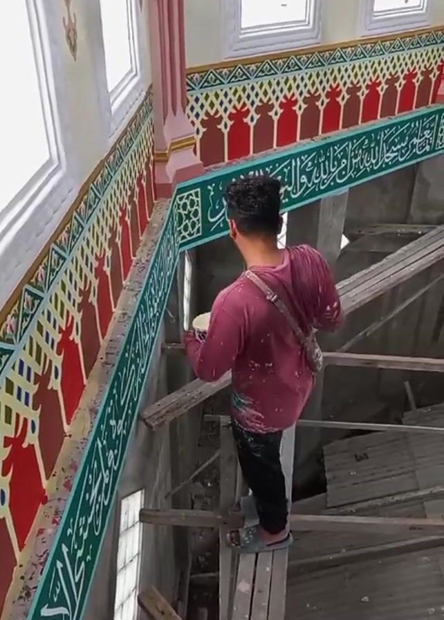 A man is painting the interior of a building. He's standing on wooden planks that are resting on scaffolding. He is wearing a maroon shirt, black pants, and sandals. He has a small bag slung over his shoulder and is holding a container in his left hand. He is using a brush in his right hand to paint a green band that has white Arabic calligraphy on it. The wall below the green band has alternating red and yellow decorations. Above the green band is a red and green pattern. The room has multiple windows. The interior is still under construction. The man is focused on his task.