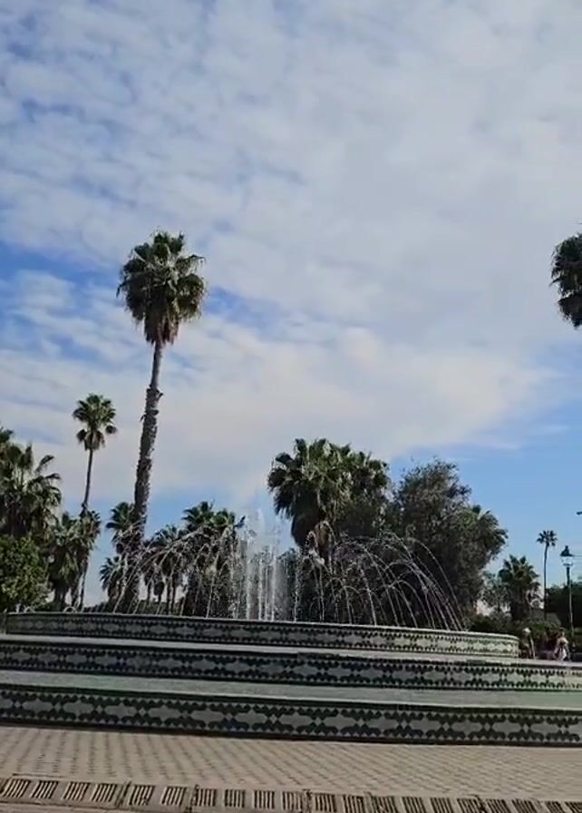 Here's a detailed description of the video: The video shows a park or public area with a fountain as its centerpiece. The fountain is multi-tiered and decorated with green and white tiles. Water is spraying from the fountain, creating a dynamic display. Palm trees are scattered throughout the scene, adding to the tropical feel. The sky is blue with scattered white clouds. In the video, people are walking and sitting near the fountain, enjoying the surroundings. A person rides a black electric scooter on the pathway in front of the fountain. The scooter has a distinctive design. The paved pathway in the foreground leads toward the fountain, adding to the depth of the scene.