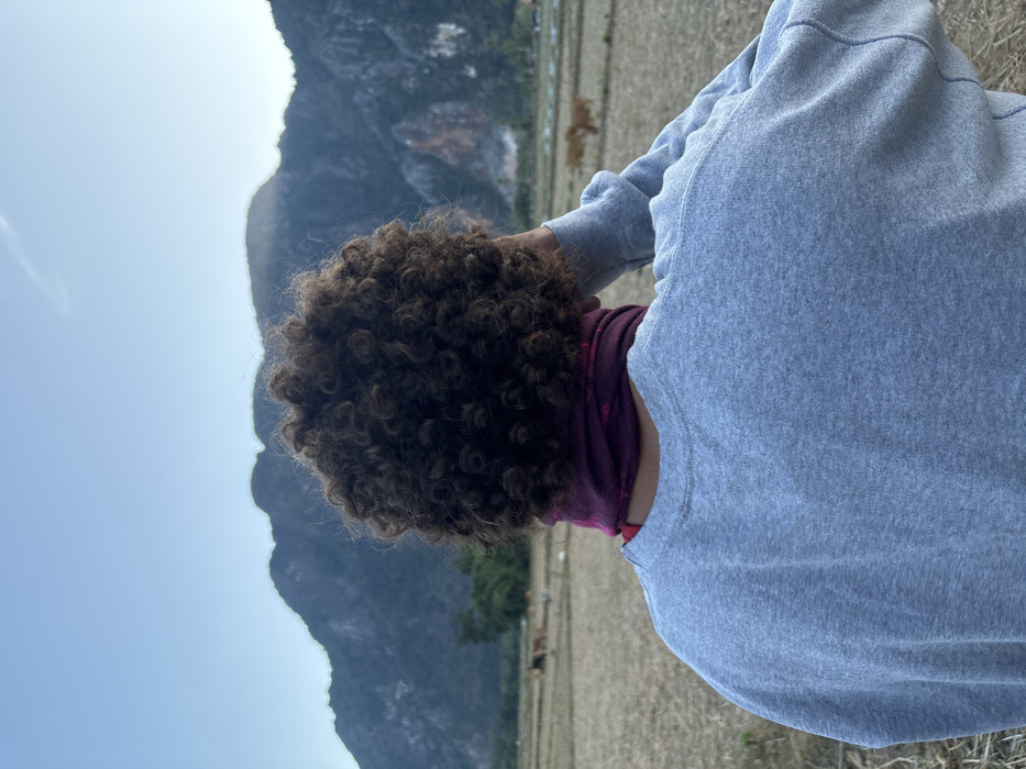 This image presents the back of an individual standing in a dry, stubbled field in Naka, Laos. The subject has dark, curly hair and is wearing a light grey long-sleeved shirt over a dark purple neck gaiter. The right arm is bent, with the hand positioned near the back of the head. Several brown cows are visible in the mid-ground within the field. The distant background features a prominent range of dark, rugged mountains under a clear, light blue sky. The scene is illuminated by soft, natural daylight.