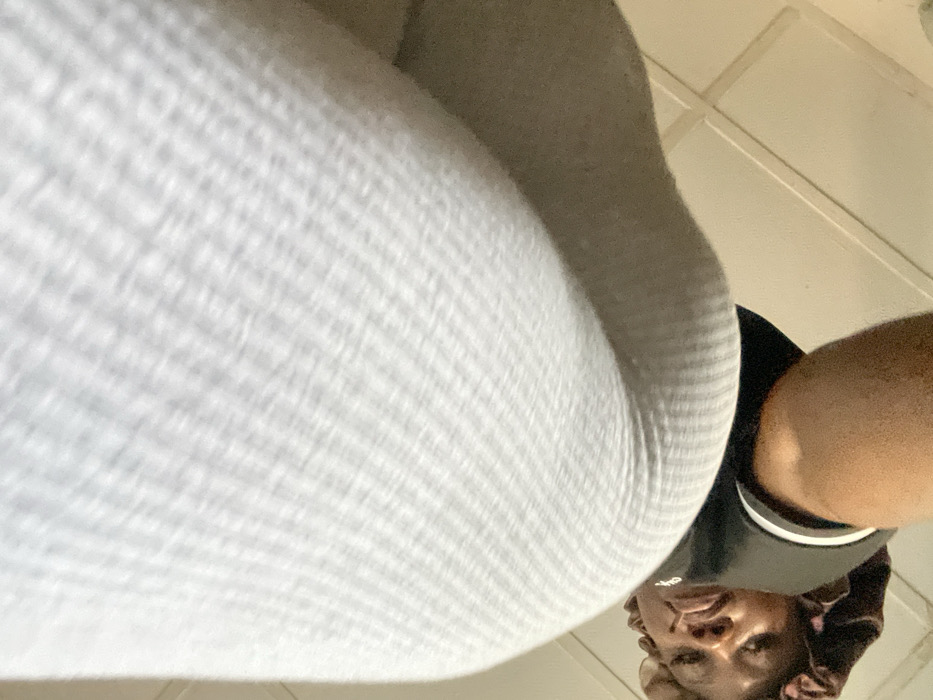 The image displays a low-angle perspective looking upwards. A significant portion of the frame, primarily the upper and central areas, is occupied by a light-grey, ribbed or textured fabric, indicating extreme proximity to the camera. In the lower-left quadrant, an individual with dark skin is partially visible, wearing a black top with white trim and a dark, possibly satin, head covering. Their gaze appears directed downwards or towards the camera. A segment of their bare arm is also visible in the lower-left. The background, in the lower-right, features a light-colored surface with discernible grid lines, possibly indicating a tiled wall or ceiling indoors. The specific location within Ajaokuta, Nigeria, cannot be determined from the visual information provided.