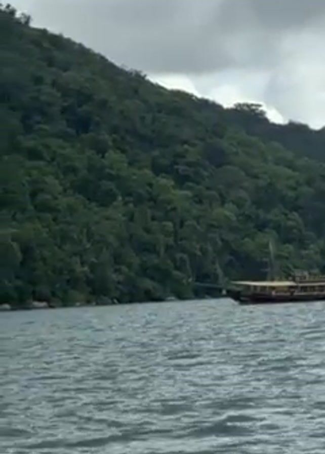 body of water with a wooded hillside in the background. A multi-decked tourist boat, dark red with a gold roof, is moving across the water in the distance, from left to right. The water surface is choppy, with many small waves. The hillside is covered in dense green trees. The sky is overcast with gray clouds. Music is audible in the background.