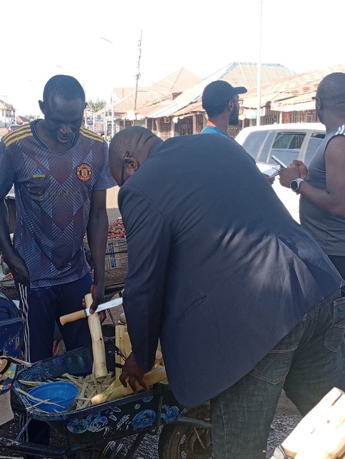 A man in a Manchester United t-shirt stands by a small cart, cutting sugar cane with a large knife. Another man in a dark suit leans over the cart, possibly purchasing the cane. Two more individuals are in the background, one in a baseball cap and another in a tank top, both looking at their phones. The scene appears to be set outdoors, possibly at a market or roadside stall with buildings visible in the background.