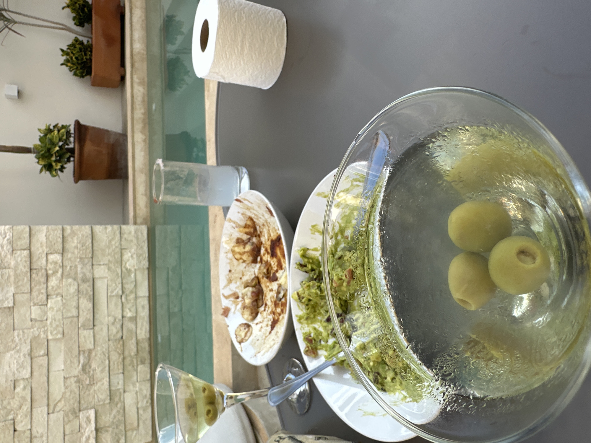 This is an indoor or outdoor setting at a table, perhaps in Brisas de Zicatela, Mexico. The table holds a half-empty martini glass with olives, along with a plate of mostly eaten guacamole, another plate with remnants of food, an empty glass, and a roll of toilet paper. A silver spoon is on the table next to the plate of guacamole. In the background, there is a stone-tiled wall, potted plants, and a narrow channel of water.