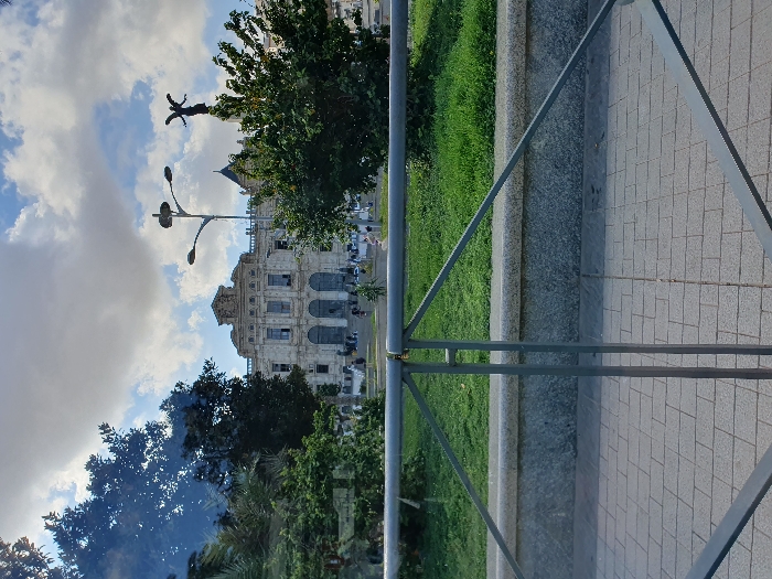 view from a low angle looking up through a metal railing toward a building. The building appears to be an older, two-story structure with a light-colored facade and windows. There are trees and plants in the foreground and background. The sky is partly cloudy. The image is taken in Oran, Algeria, at the coordinates 35.704, -0.65. The photo is taken from the sidewalk in front of a building. The railing is in the foreground, and the building is in the background. The building is tall and has a lot of windows. There is a small patch of grass behind the railing. The sky is blue with white clouds.