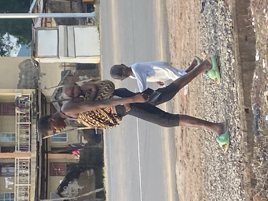 An adult figure, identified as likely female, with short dark hair and wearing a dark top, black capri pants, and light green slide sandals, walks from left to right on a gravel and dirt path. A baby is secured to her back with a patterned fabric wrap of brown, beige, and black stripes. Her right hand holds a metallic object, possibly a knife or machete, positioned at hip level. Alongside her, a young child, dressed in a light-colored, long-sleeved tunic and light green slide sandals, holds the adult's left hand with their right hand, looking directly at the viewer. Adjacent to the path is an asphalt road with a white dividing line. In the background, across the road in Adankolo, Nigeria, stands a two-story building featuring multiple windows, red doors, and white balcony railings, showing signs of wear. To the right of this building, a smaller, white, kiosk-like structure with a rectangular opening at the top is visible. The scene is under bright daylight.