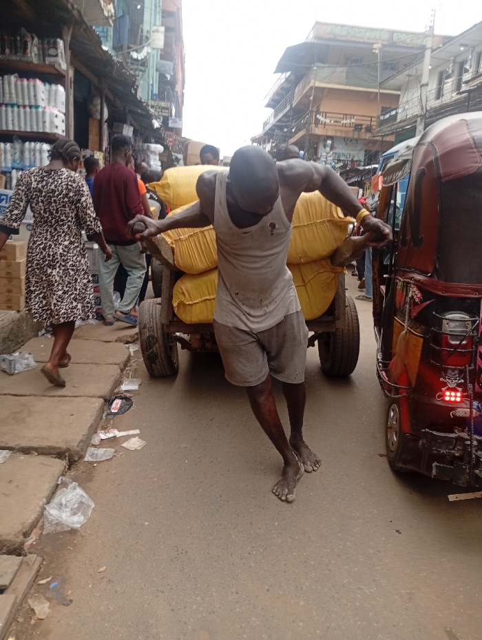 The image portrays a bustling commercial street in Fegge, Nigeria, under an overcast sky. Central to the scene, an adult male, barefoot and dressed in a soiled white tank top with a tear on the left side and grey shorts, exerts significant effort pulling a four-wheeled handcart. His arms are outstretched and tensed, gripping the front of the cart, which is heavily loaded with multiple large, yellow-orange sacks. A yellow-gold wristband is visible on his right wrist. To the right of the handcart, the rear section of a red and brown motorized tricycle (Keke Napep) is visible, featuring a distinctive rear light assembly composed of six red LEDs arranged in a skull-like pattern. On the left, a woman in a patterned brown, black, and white dress walks away from the camera on a raised, uneven concrete sidewalk. She is barefoot or wearing very flat sandals. The street surface is asphalt, and the sidewalk shows signs of wear and cracking. Litter, primarily plastic bags and debris, is scattered along the curb and on the sidewalk. Both sides of the narrow street are lined with multi-story buildings, typical of a market or commercial district. Shops on the left display merchandise, including stacks of white containers. Overhead, various utility wires are visible. Several other individuals are partially visible in the mid-ground, contributing to the crowded urban environment.