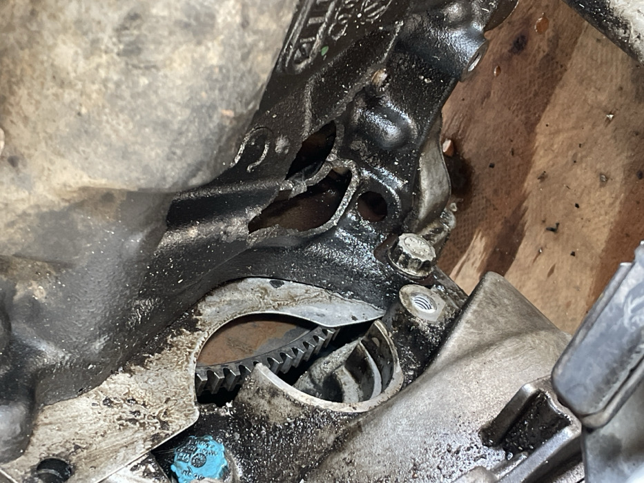 The image displays a close-up view of a heavily soiled and damaged mechanical assembly, likely from an internal combustion engine or transmission