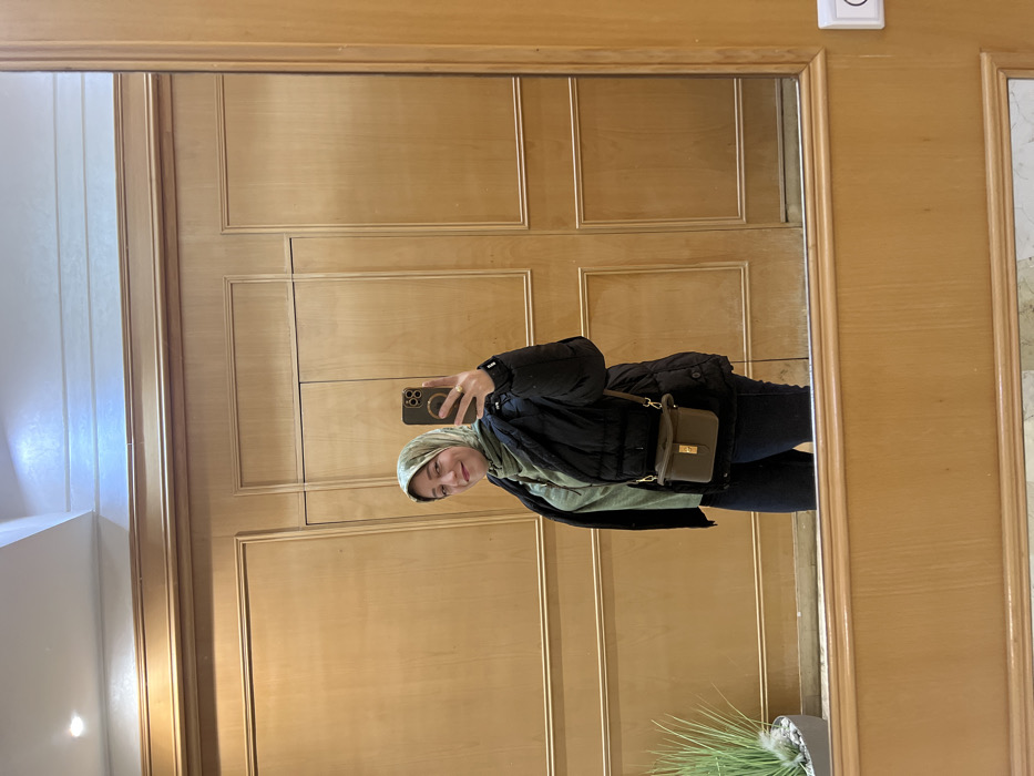 A female subject is depicted in a mirror selfie within an indoor setting in the city of Meknes, Morocco. The subject, positioned centrally, wears a light green patterned hijab, a light green long-sleeved top, a black puffer jacket, and dark pants. A small, rectangular, olive-green cross-body bag with a gold clasp is worn over her right shoulder. She holds a dark-colored smartphone, equipped with a circular magnetic accessory on its case, in her right hand, angled to capture her reflection. The subject exhibits a slight smile and is looking towards the phone's lens. The mirrored background reveals light-brown wooden paneling with recessed molding, indicative of a well-maintained interior space. A partial view of a decorative plant with slender green leaves, situated in a grey planter with white pebbles, is visible to the left within the reflection. The ceiling, also reflected, appears light-colored with recessed lighting fixtures. Outside the mirror's frame, on the right, a white electrical outlet or switch is partially visible against the wooden wall.